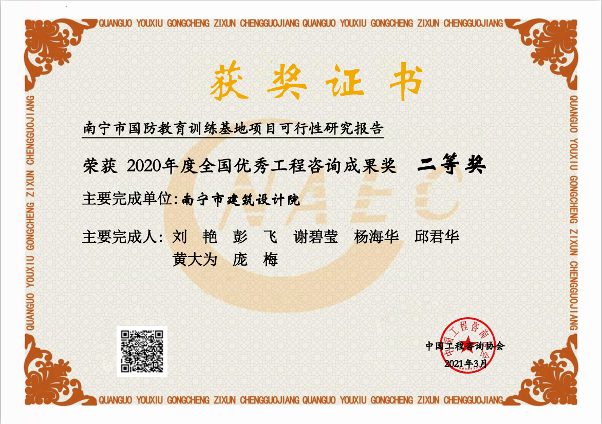 3月,中國工程咨詢協(xié)會(huì)發(fā)布了2020年度全國優(yōu)秀工程咨詢成果獎(jiǎng),由我公司申報(bào)的《南寧市國防教育訓(xùn)練基地項(xiàng)目可行性研究報(bào)告》獲得2020年度全國優(yōu)秀工程咨詢成果獎(jiǎng)二等獎(jiǎng)。此前,該成果報(bào)告還獲得了2020年度廣西優(yōu)秀工程咨詢成果一等等次。