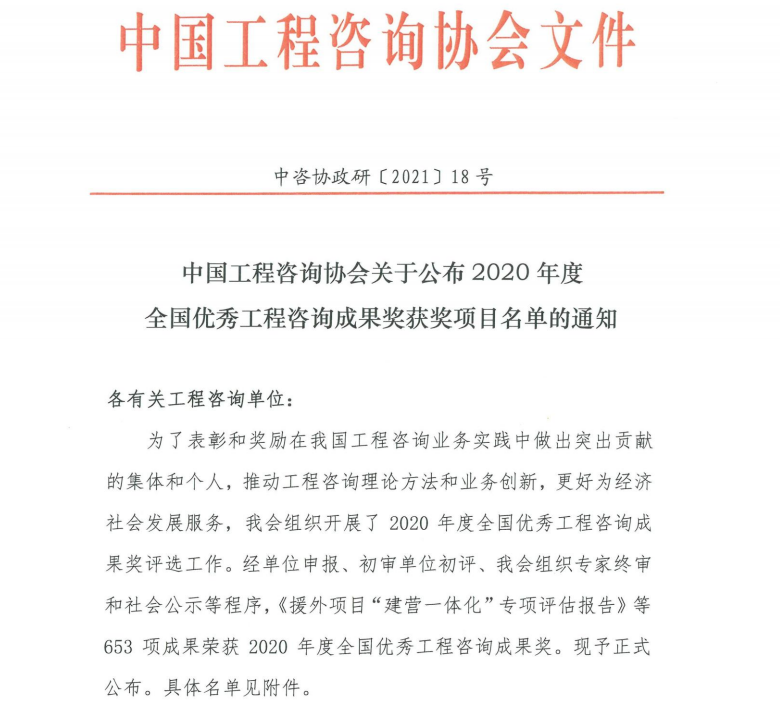 全國優(yōu)秀工程咨詢成果獎(jiǎng)是由中國工程咨詢協(xié)會(huì)組織評(píng)選的工程咨詢行業(yè)權(quán)威性全國性獎(jiǎng)項(xiàng),涵蓋規(guī)劃咨詢、項(xiàng)目咨詢、評(píng)估咨詢、全過程工程咨詢、政策研究專題報(bào)告五部分內(nèi)容,每?jī)赡暝u(píng)選一次,是我國工程咨詢領(lǐng)域最高獎(jiǎng)。