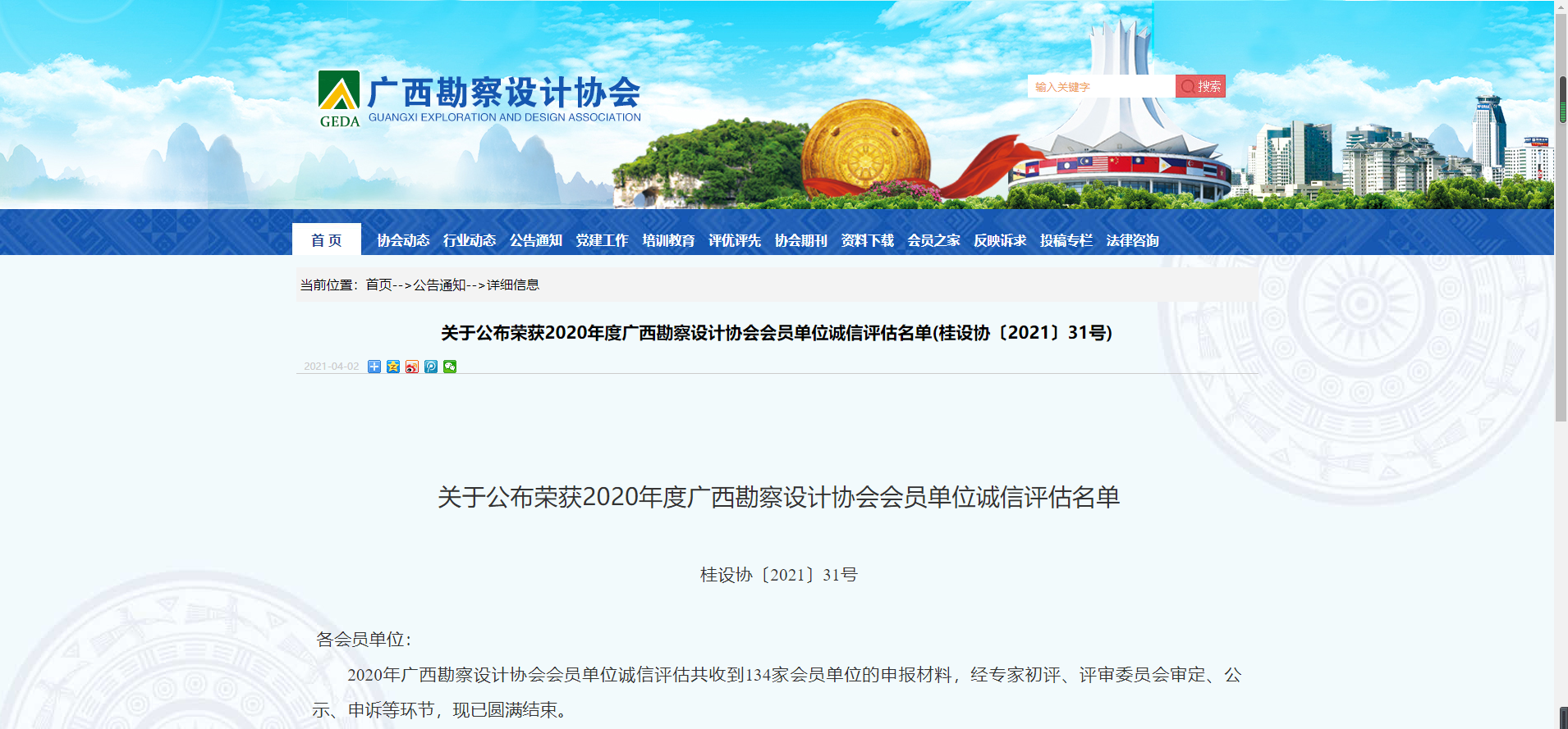 為推動(dòng)廣西勘察設(shè)計(jì)行業(yè)誠信建設(shè),廣西勘察設(shè)計(jì)協(xié)會(huì)于2020年11月啟動(dòng)了2020年廣西勘察設(shè)計(jì)協(xié)會(huì)會(huì)員單位誠信評(píng)估工作。此次誠信評(píng)估工作共有134家會(huì)員單位申報(bào),經(jīng)專家初評(píng)、評(píng)審委員會(huì)工作會(huì)議審查、公示等多個(gè)環(huán)節(jié),共有47家會(huì)員單位滿足誠信評(píng)估等級(jí),其中,獲評(píng)AAA級(jí)誠信單位20家,獲評(píng)AA級(jí)誠信單位11家,獲評(píng)A級(jí)誠信單位16家。