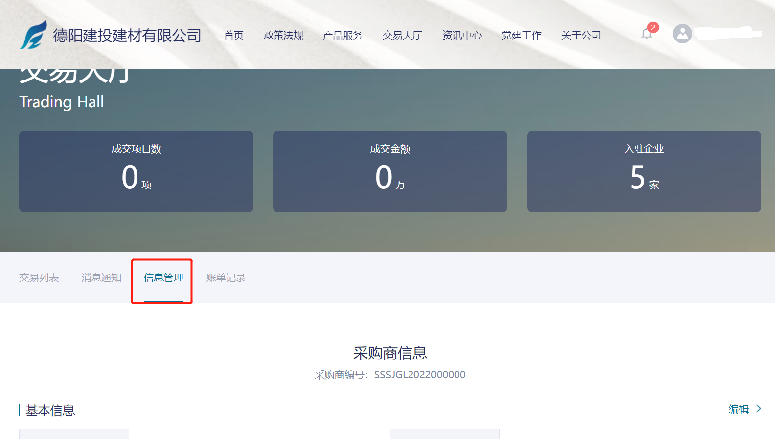 采購(gòu)商用戶點(diǎn)擊【交易大廳-信息管理】,進(jìn)入信息管理頁(yè)面,提供采購(gòu)商信息、賬戶余額、 資質(zhì)材料、參與項(xiàng)目(合同簽訂)等功能;如圖 4 所示;